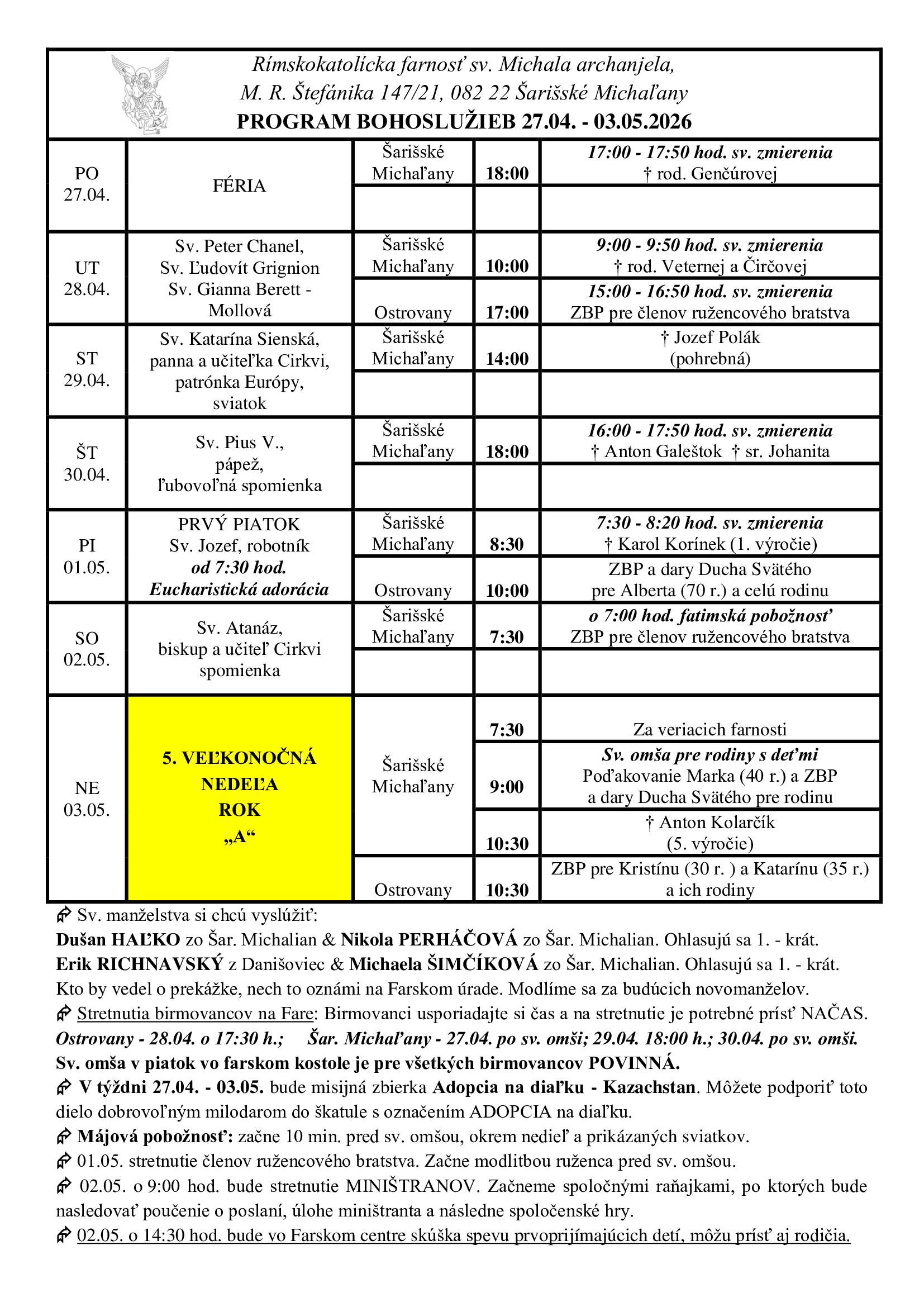 FARSKÉ OZNAMY 27.04.-03.05.2026